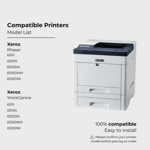 : Print up to 5, 500 black and 2, 400 color pages with our Xerox Phaser 6510 toner, perfect for high-volume tasks. Ideal for WorkCentre 6515 users needing high-capacity cartridges ^^: Includes
