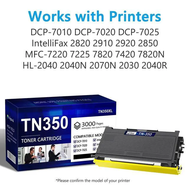 Printer model: Compatible for brother TN350 Super high yield toner cartridge black DCP-7010 DCP-7020 DCP-7025 IntelliFax 2820 2910 2920 2850 MFC-7220 7225 7820 7420 7820N HL-2040 2040N 2070N 2030 2040R Printer ^^ We only produce high-quality products. Each toner cartridge undergoes a strict quality inspection process and the refined toner provides high-quality images and text. The intelligent chip automatically identifies the toner capacity ^^ Our products have a five-year warranty period. If you have any technical questions please feel free to contact us at any time