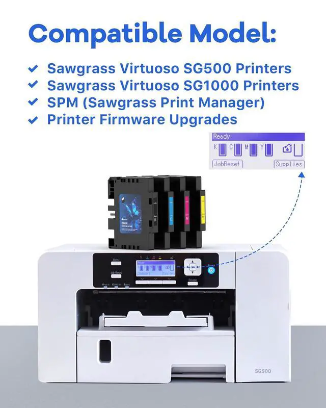 Compatible with: Sawgrass SG500 and SG1000 sublimation printers, SPM (Sawgrass Print Manager) and printer firmware upgrade. Backwards compatible with 3.09 firmware versions.