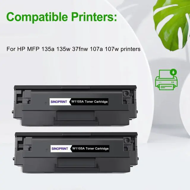 Compatible PrintersUse for HP MFP 135a 135w 37fnw 107a 107w printers. ^^ Package Contents2 Pack Black 105A W1105A Laser Toner Cartridges. ^^ Page Yield3, 000 pages for 105A black toner cartridge at 5% coverage on Letter/A4.