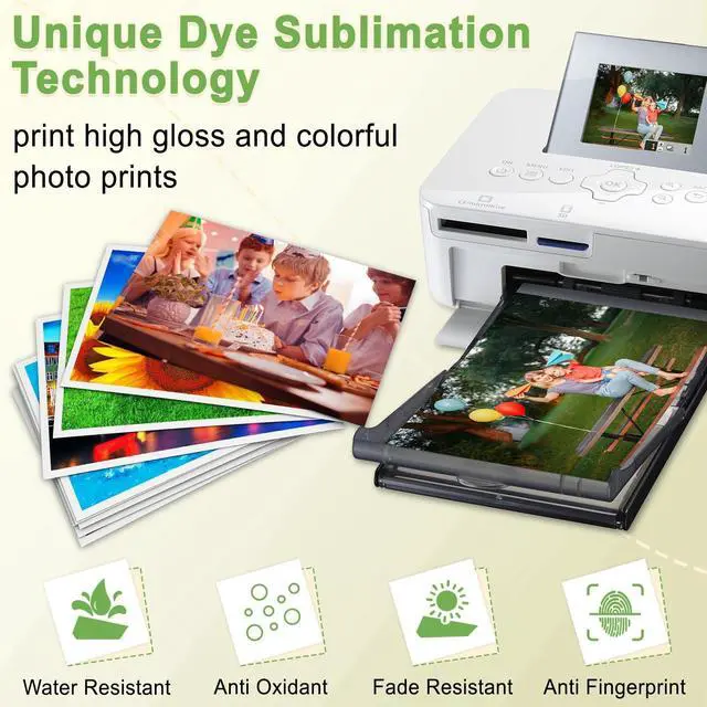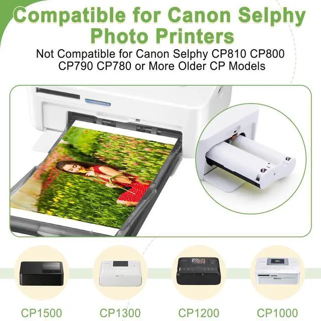 Compatible Canon Selphy CP1300 CP1500 CP1200 Color Refill Ink Paper sheet can print High gloss and Colorful photo prints with a Canon watermark on the reverse side. The 108 sheets paper prints feature a unique dye sublimation technology for extraordinary colorful results and Smudge-free, Water resistant, Anti-fingerprint, Anti-oxidation photos ^^ The RP-108IN compatible for canon photo printers selphy: Canon Selphy CP1500 CP1300 CP1200 CP1000 CP910 CP820 photo printers, but Not Compatible for Canon Selphy CP810 CP800 CP790 CP780 or More Older CP Models ^^ Each Set of this Compatible for canon selphy RP108 Ink/Paper Set includes 2 Color Ink Cartridges (each has ink matching for 54 prints) and 108 Sheets 4 x 6 inch photo Paper ^^ The canon selphy cp1500 photo paper size of the prints are pre-cut - 4 x 6 inch postcard size photo sheets. The RP-108IN are great for printing out colorful pictures and prints directly out of your printer at home, office and everywhere ^^ The canon selphy cp1300 photo paper RP-108IN set is perfect to print the colorful and high quality postcard-sized pictures and documents. It is very convenient to print at home, office and everywhere. The set is very easy to be operated