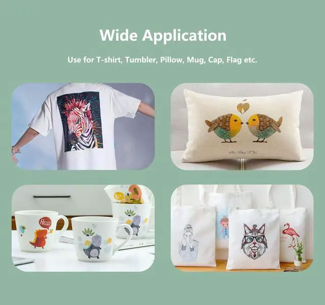 Wide Application: Sublimation ink can be used on polyester or polyester coated items such as T-shirts, sock, cap, tumbler, pillowcases, mugs, phone cases, quilts, cross-stitch, shoes, ceramics, boxes, bags, flags, banners, etc;