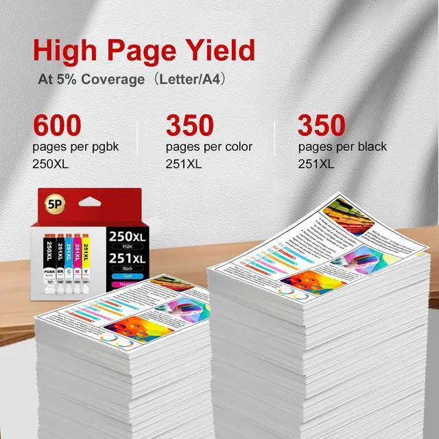 Yield: 780 pages per 250XL Large Black (PGBK), 350 pages per 251XL black, 350 pages per 251XL color cartridge at 5% coverage ^^
