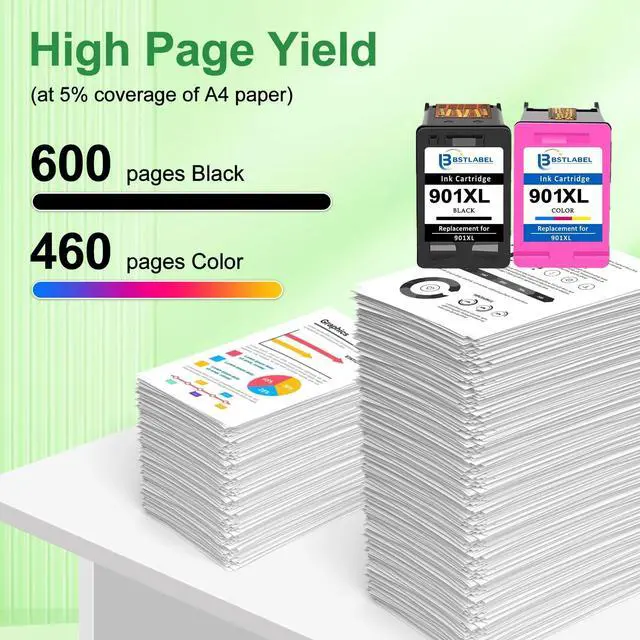 ^^ High Yield: Up to 600 pages per BSTLABEL for 901 XL for HP 901 black ink cartridge high yield & 460 pages per BSTLABEL for 901XL color ink cartridge for HP printer at 5% coverage. ( A4 paper size ) ^^