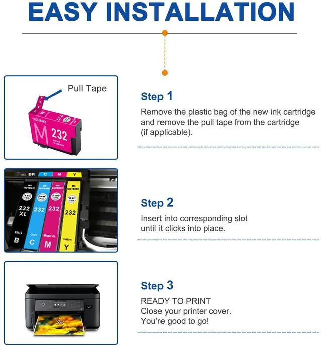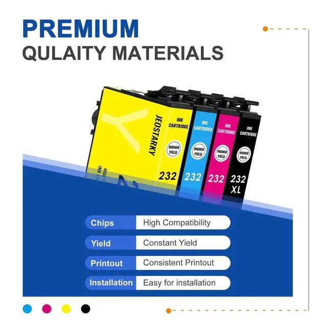 Set: 232XL ink cartridges for Epson printers Includes 1 black, 1 cyan, 1 magenta, and 1 yellow cartridge, accompanied by a detailed user guide for easy setup and versatile printing needs ^^ NoteAII brandnames and trademarks a re the properties of their respective owners and a re used for identification purpose on