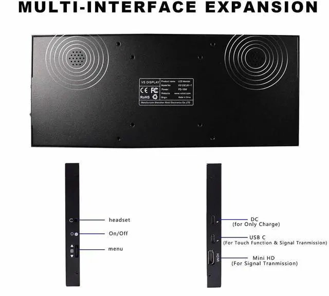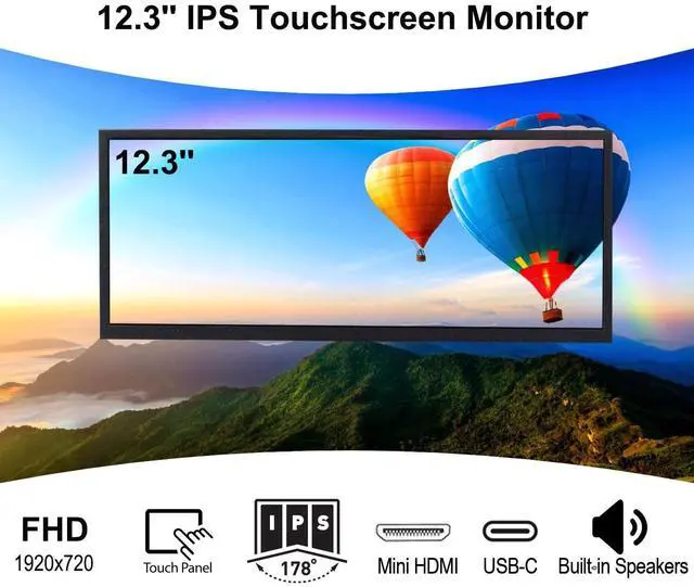 Power input: USB C port ^^ Widely ApplicationStrip style monitor, widely used as a extra display, secondary display for computer/laptop/pc temperature GPU CPU RAM monitoring ^^ Packing List1 12.3 inch 1920x720 VS123ZJ01-T Capacitive Touch LCD Monitor; 1 USB-C Power Cable; 1 USB to USB-C Power Cable; 1 to Cable