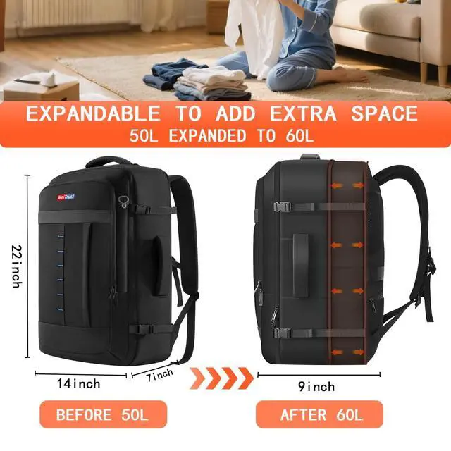 50-60L Expandable Suitcase Alternative Backpack with 3 Carry Modes - Enjoy Suitcase-Level Capacity Without the Bulk Effortlessly switch between padded shoulder straps, a reinforced side handle, and the back luggage strap for hassle-free suitcase-style travel. The dedicated cable port keeps your charging cords or headphones within arms reach for on-the-go convenience.