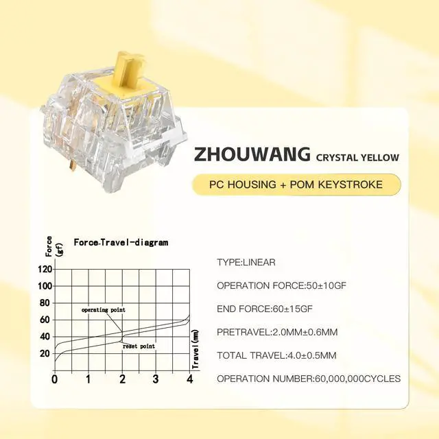 ^^ Specification quality: Operating force 5010gf, Pressure point force 6010gf, Pretravel 1.950. 6mm, Total Travel 4.0 +0/- 0.6 mm, lifespan of about 80 million keystrokes.