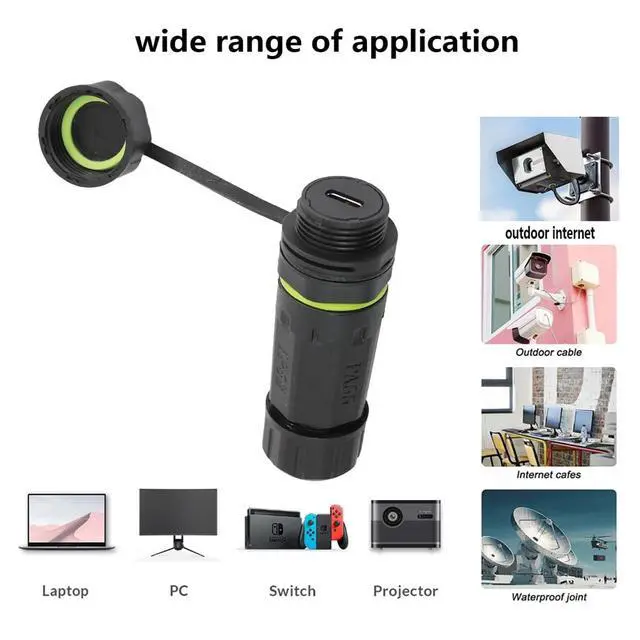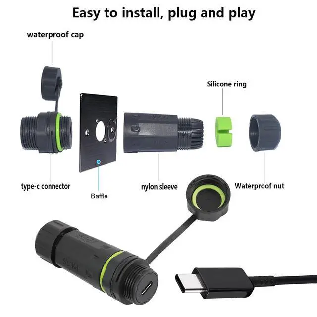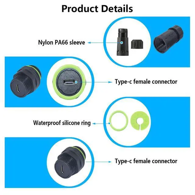 USB Type C 3.1T ype-C Panel mount connector, the copper needles uses brass solid terminals and the surface is gold-plated, transmission speed up to 5Gbps, and it supports charging to your devices with Type C input. ^^ IP68 WaterproofThe Waterproof USB-C Coupler are IP68 Compliant. It can prevent the network parts from moisture, dirt rain & snow for quality connections. And the waterproof sleeve can be adjusted in position to suit your needs, and both ends can be used. ^^ Easy to useUSB C Female to Female bulkhead connector with nylon PA66 shell, waterproof and flame retardant, especially suitable for outdoor environments that require network transmission.