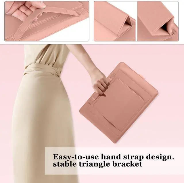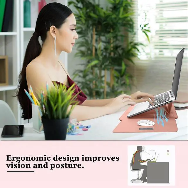^^ Innovative 3 in 1 FuntionThis laptop sleeve combines a laptop stand, laptop protective, and mouse pad in one. The flap doubles as a mouse pad, and the stand features a foldable design. Compact, lightweight, and stylish, it's perfect for travel or office use. ^^ Adjustable StandThe foldable triangular stand accelerates heat dissipation and extends the life of your laptop. Placing your laptop on the stand allows you to adjust your viewing angle, reduce pressure on your cervical spine, and alleviate hand fatigue from typing, allowing you to use your laptop in the most comfortable position.