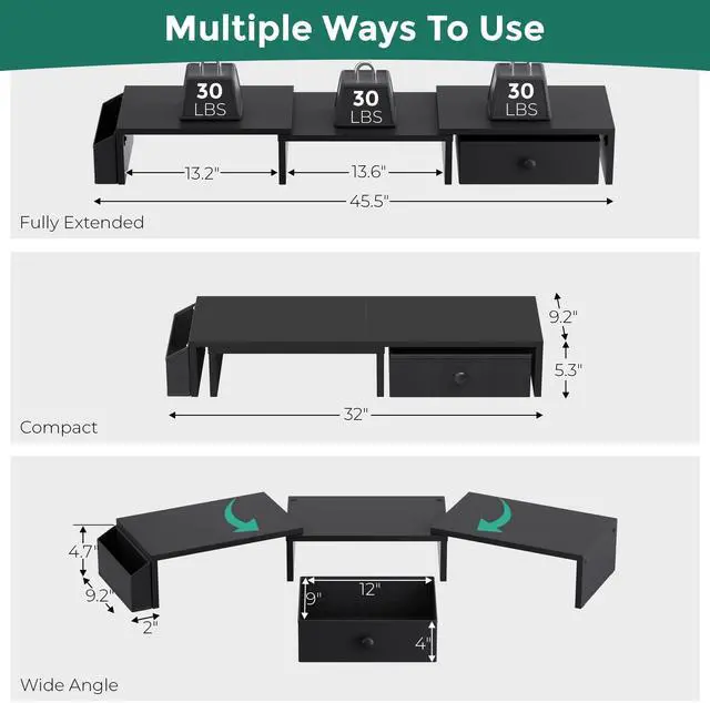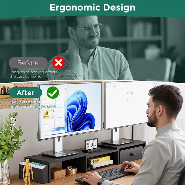 DUAL MONITOR STAND WITH ADJUSTABLE LENGTH & ANGLEThis versatile monitor stand riser extends from 31.5" to 43" to accommodate dual monitors or a single large screen, perfect for home office setups. The adjustable angle allows you to find the optimal viewing position, enhancing productivity and comfort throughout your workday. ^^ ERGONOMIC DESIGN FOR HEALTHY POSTUREElevate your monitors to eye level with this desk riser, reducing strain on your neck, shoulders, and back during long work sessions. The 4" height promotes better posture, helping to prevent discomfort and fatigue while you focus on your tasks.