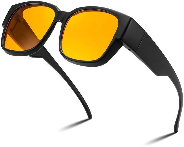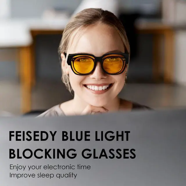 Two Wearing Styles - FEISEDY Oversized Fit Over Blue Light Glasses suitable for most prescription eyeglasses or can be worn on its own. No need to change glasses. ^^ Anti-Blue Light Lenses - FEISEDY blue light blocking glasses feature yellow lenses to protect your eyes by effectively blocking harmful blue light, reduce eyestrain and headache, improve your sleep quality. Bring you better sleep and better spirits. ^^ Comfortable to wear - The FEISEDY Blue Light Glasses made of lightweight and sturdy material, these blue light glasses are comfortable to wear for long periods of time without putting pressure on your nose or ears.