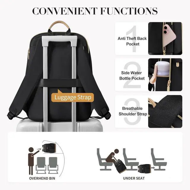 LUGGAGE STRAP DESIGN & TRAVEL-FRIENDLY: There is a luggage strap on the back of the travel backpack, so you can put the laptop backpack on the luggage and slide with it, it helps you free your hands and back from the burden. The computer backpack for women men can fit in an airplane luggage rack or under a seat, ensuring everyone can ride with ease ^^