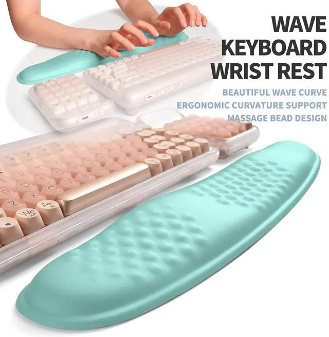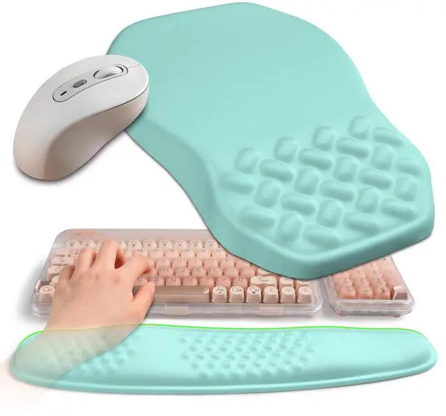 Ergonomic SetWave Keyboard Wrist Rest x1( 17.1 x 3.7 inch, 435x95mm) and Massage Slope Mouse Pad Wrist Support x1( 11.8 x 7.9 inch, 300x200mm), ergonomic curvature design optimization, more in line with the natural position of the shoulder during work, alleviates carpal tunnel syndrome and wrist pain ^^ Wave and SlopThe unique wave curve adjusts the height difference between the wrist and the keyboard. The 165 double-slope mouse pad closely fits the wrist curve support, adjusts the joint and wrist posture, relieves the pressure on the elbows and shoulders during long-term work, and keeps you in the most comfortable state ^^ High Density Smooth FabricHigh density abrasion resistance smooth fabric, easy to slide and improve cursor signal reflection accuracy, accurately capturing sensor displacement distance and precise positioning ^^ Unibody Memory FoamAdopting the pressure integrated molding process, it has the advantages of strong support and slow rebound, soft and comfortable, and will not collapse during long-term use ^^ Micro Stick PU BaseThe base is made of anti slip PU material with slight adhesive properties, firmly attached to the desktop to prevent accidental movement of the mouse pad and ensure that the mouse slides freely