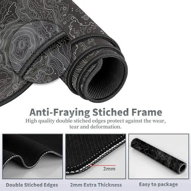 ^^ Natural Rubber Base The soft and dense non-skid nature rubber base keeps this oversize desk pad firmly in place. This long mouse mat remains uniformly flat even over imperfect surfaces. Just immerse your work or games without worrying about the annoying mouse pad movement. ^^ Edge Banding Desgin The full desk mouse pad Sewing frame ensures no friction or sagging. The edge trim design prolongs the service life and prevents the narrow top strip from leaving the base. Reinforced edges prevent deformation or damag ^^ Washable Design Desk Pad A spill-proof coating makes liquids slide right off the surface.