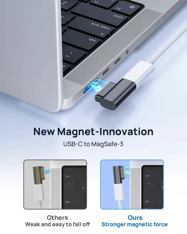 Charge your MacBook safely with Lanhiem adapterAvoid the damaging strain on your MacBook ports caused by incessant plugging and unplugging and the risk of your laptop shutting down when you trip over your cable. The Mag-safe 3 is back! Quality & designThe magnetic adapter is made of a strong aluminum structure and offers excellent durability, while the color perfectly matches your MacBook or other Apple device. 140W ChargeYou can fast charge any MacBook or other MagSafe3 device with a maximum Type-C PD of 140W. LED indicatorWhen the battery is charging, the LED indicator lights up in orange.