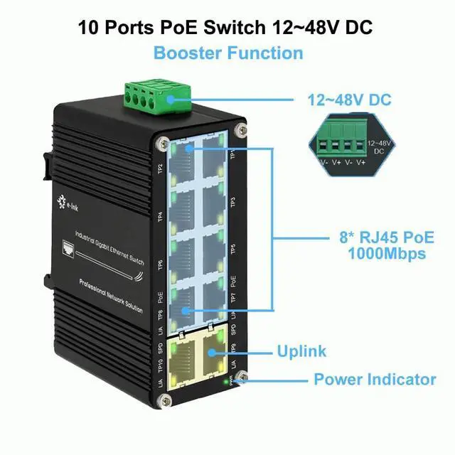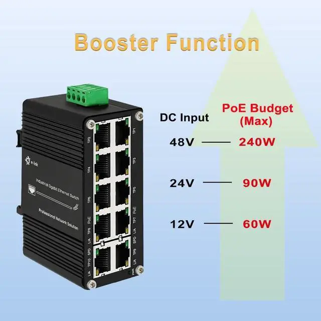 10/100/1000BASE-T Ethernet ports- Equipped with 10 10/100/1000Base-T RJ45 ports, up to 8 ports of IEEE 802.3 af/at devices powered, and up to 240-watt PoE budget. ^^ Booster Function Up to 240-watt PoE budget-