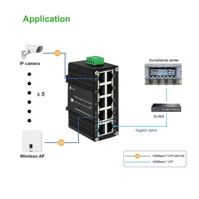 Power Pin Assignment: 4/5(+), 7/8(-). ^^ Supports DIN-Rail installation- The gigabit 10 ports switch with industrial grade aluminum alloy housing comes with 35mm din-rail mounting bracket and can install on universal din rail slot. Installation and disassembly are very simple. ^^ Industrial Grade Quality- IP40 protection grade, it can work in a wide temperature range from -40C to 80C (-40F to 176F) and 6KV lightning protection which make it can adapt to various harsh environments.