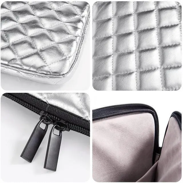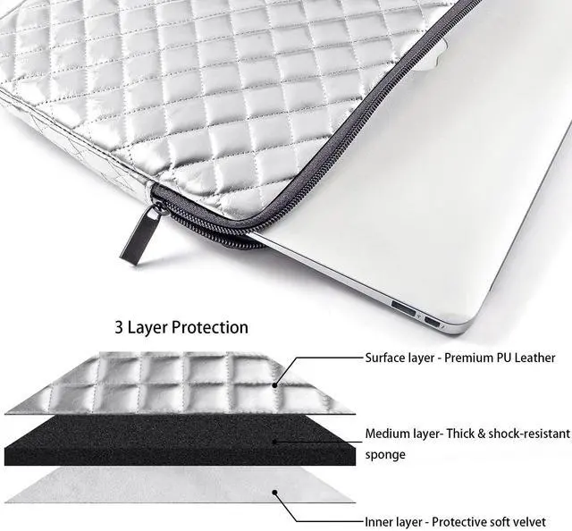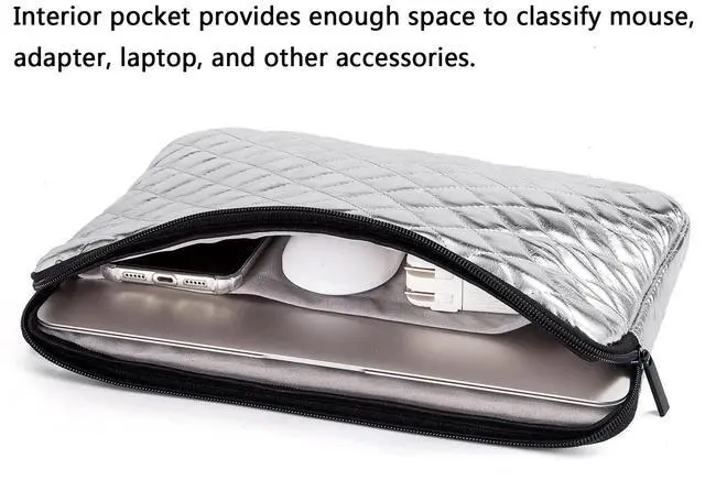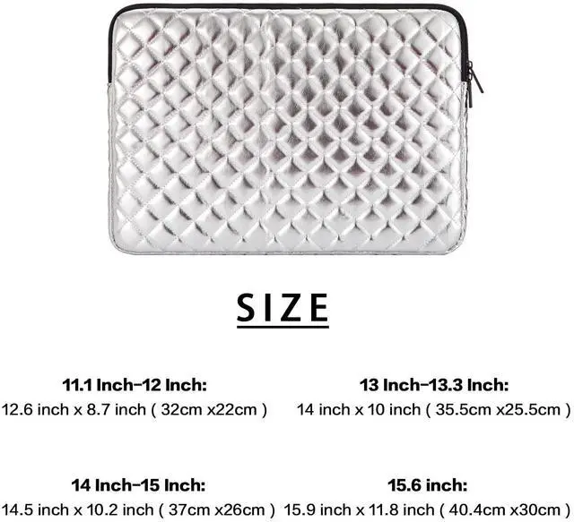 ^^ Laptop Fits Well - There is little space around the interior sides and top, so that your laptop doesnt bounce around too much inside the sleeve when carrying. And the space isn't tight, it is easy to insert and remove the laptop. ^^ Personalized and Refined Look - Gold and silver PU leather are with diamond pattern quilted, appears shiny bling and fashionable look. Cowhide textures faux leather are luxurious, refined, and quality, appears business formal look. ^^ Tips - To ensure the sleeve will fit your laptop, youd better measure your laptop and compare it with the product interior dimension before purchasing.