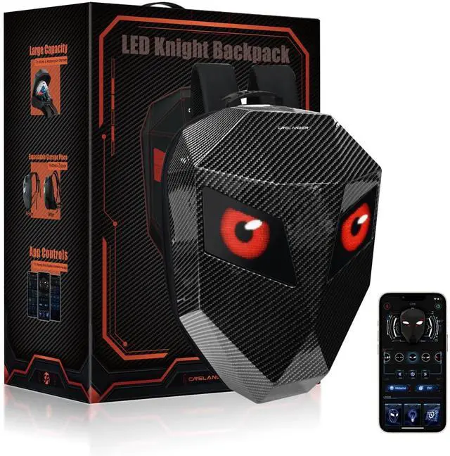 Multipurpose: LED backpack size is about 13.5 * 7.5 * 18.8 in which have enough storage. Large zipper pocket as a laptop bag, put a tablet computer; the interior has a number of independent small compartments, can effectively store cosmetics, tissues, keys, textbooks, mini ipad, cell phones, umbrellas, some sports equipment, etc.... ^^ How to useSearch on your mobile phone or directly scan the code to download the APP, plug in the mobile power supply through the built-in USB data port on the back, turn on the Bluetooth and scan the QR code to bind the backpack. You can connect the device and use it. ^^ Cool GiftThe LED Knight Backpack with programmable screen is also the best gift for yourself or others on the Christmas, Birthday, Valentine's Day.... ^^ NOTE 1 Since this is newly produced, some kind of smell is possible. Please donot worry about it, put the opened backpack in a ventilated and dry place for some times, no flavor. ^^ NOTE 2 If you found any question and problem after receipt the backpack, please contact us for help firstly.