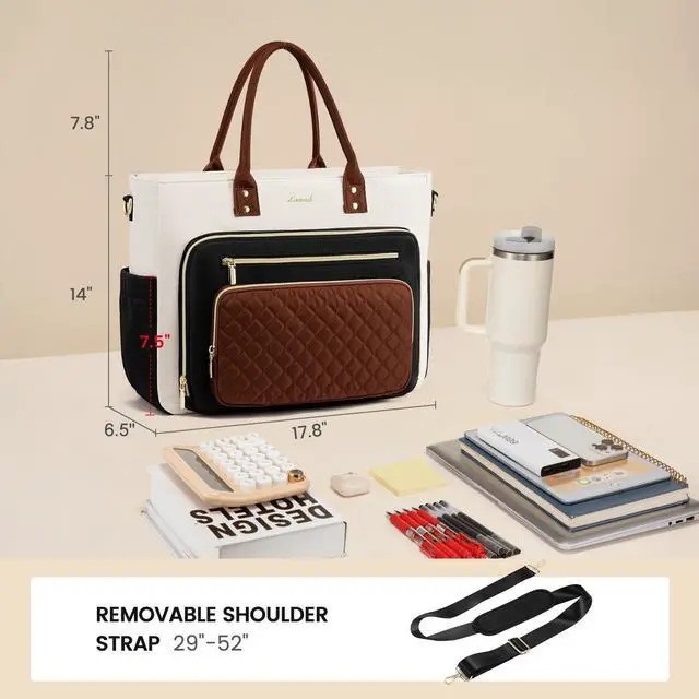 With Large Cup Holder: Designed for your large water bottle, our laptop tote bag features an elastic side pocket that holds up to 31oz. The innovative design allows the cup's handle to fit perfectly, ensuring stability and easy access. This dedicated side pocket is ideal for those always on the go, combining style with functionality. Ideal for professionals, travelers alike. ^^ Ample Storage & Padded Laptop Compartment: this laptop bag features a padded laptop sleeve for excellent impact protection, ideal for work, business, travel, or everyday use. The spacious main compartment easily accommodates books, folders, and more, making it versatile as a teacher bag or nurse bag. Perfect for new parents as a diaper bag, it organizes baby essentials like clothes, diapers, and bottles efficiently. ^^ Work & Travel-FriendlyEffortlessly blend style and function with our versatile tote bag, designed for the modern traveler. Featuring a luggage sleeve for easy carry-on attachment, adjustable, removable shoulder straps, and sturdy handles. Made from premium waterproof, scratch-resistant material, its your ultimate work, commute, daily use and business travel companion. ^^ Perfect for
