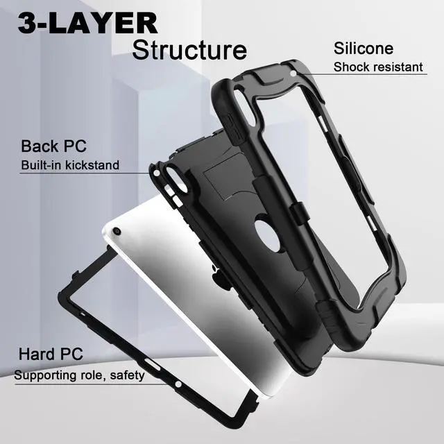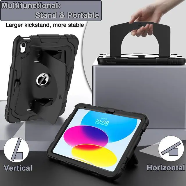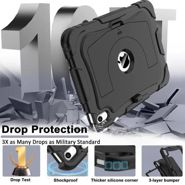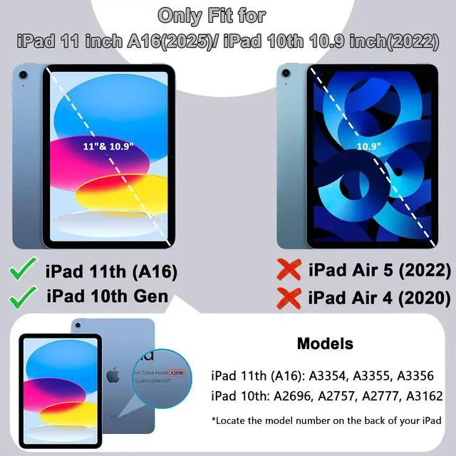 Model Specification Designed for iPad (A16) 11th generation 11 inch/ 10th generation 10.9 inch (Model includes: A3354/A3355/A3356/A2696/A2757/A2777/A3162) 2025/2022 released. Please check back bottom of your iPad to find the model number. ^^ Lager&Harder KickstandThis ipad 11th generation case kickstand features a dual-angle viewing with a reinforced, larger design for stronger stability, ensuring your iPad stays secure wherever you want to use it. Meanwhile, you can simply pop out the kickstand vertically to use it as a handle. This allows you to lift and transport the device effortlessly whenever required. ^^ Efficient Protection The 3-in-1 ipad case 11th generation has successfully passed the military collision test. It is made of high-quality silicone shell and durable hard PC back and front frame, which can effectively mitigates damage to your iPad caused by high-altitude drops, accidental falls, violent collisions. ^^ Precise Cutouts All controls of ipad a16 case are easily accessible for all iPad functions without removing your iPad from the case. The raised edges keep the screen and camera elevated to prevent scratches on surfaces. And the pen holder design provides a secure place for your pens to rest. ^^ Tester SayTester find the iPad case durable, with some of them mentioning it survived an impact without damage, and appreciate that it comes in various colors.