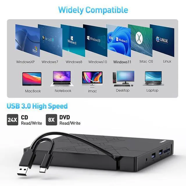 Just connect usb dvd drive to your computer and it will be automatically detected. Built-in cable, convenient storage, dont worry about cable loss. The cd adapter for computer has strong error correction, anti-skid and quiet capabilities. ^^ WIDE COMPATIBILITY- The external dvd burner for laptop is compatible with Windows XP /2003 /Win 11/Win 10 / Win 8 / Win 7 / Vista / Linux / Mac OS X systemsWindows 11 requires media player and network, compatible with laptops, computers, notebooks, and desktops. In addition, the cd to mp3 converter also supports reading and writing of CDR/RW, CD-ROM, DVDR/RW, DVD-RAM, VCD, and SVCD.