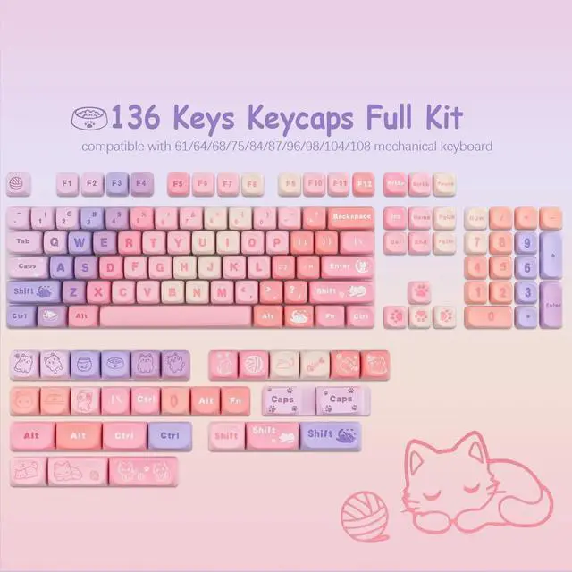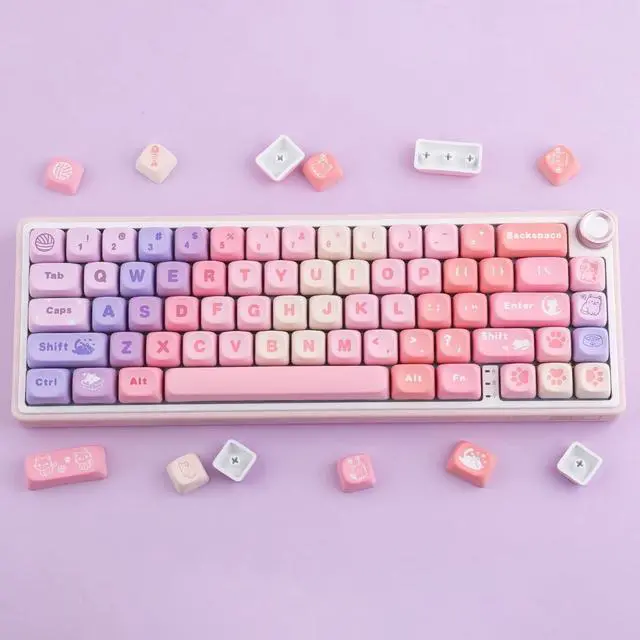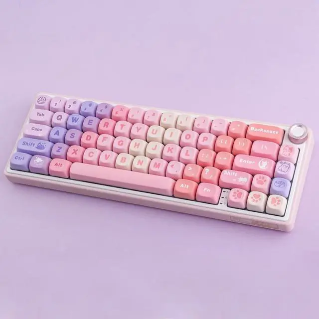 Purple Gradient Cat KeycapThe inspiration for keycap comes from colorful candy, each keycap presents a smooth gradient effect from bright colors to soft macaron colors, paired with playful cat elements, adding vitality and fun to your keyboard ^^ Durable PBT KeycapsThe keycaps are made of durable PBT material, which has a matte texture and anti grease coating, is wear-resistant, finely crafted, not easy to get dirty, and can maintain clear patterns for a long time, bringing a comfortable typing touch ^^ MOA Keycaps MOA profile keycap is a high-performance mechanical keyboard keycap with rounded edge lines and a stronger sense of curvature.