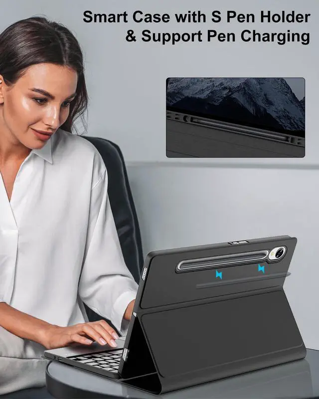 ^^ Rechargeable Strong Battery LifeEnjoy 70 hours of use with just 2 hours of charging. Say goodbye to disposable batteries and enjoy the convenience of our USB rechargeable keyboard. For samsung galaxy tab s9 keyboard case with a built-in rechargeable battery keyboard is a great choice for business trips and travel! ^^ Pen Holder and Supports S Pen Wireless ChargingIn addition to the built-in S pen holder for daily storage and use, which can all-around protection your pen, the protective smart case for samsung galaxy tablet s9 also has an S pen charging slot on the outside of the case.