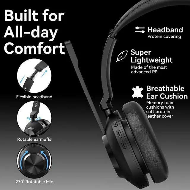 Easily manage calls and tasks across your computer and phoneno need to switch back and forth. This wireless work headset perfect for hybrid work, online classes, or multitasking between calls and mobile use ^^ One week battery life & Fast Charging Designed for all-day use, this wireless headset with mic for work delivers up to 50 hours of talk time on a full 2-hour charge (Type-C charging), with 500 hours standby. Perfect for professionals using Zoom, Teams, Skype, or WebEx-stay connected and productive without battery worries ^^ Lightweight Comfort for All-Day Use Weighing only 6 oz, this wireless computer headset with microphone features ultra-soft, breathable protein memory foam ear cushions and an adjustable headband for a perfect fit.
