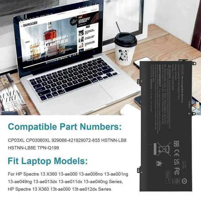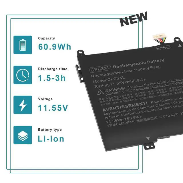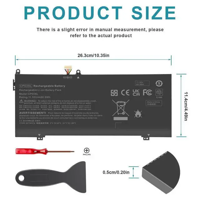 Color: Black with One Free Screwdrivers for easy installation. ^^ Compatible Part NumberCP03XL CPO3XL CP03060XL 929066-421 929072-855 HSTNN-LB8 HSTNN-LB8E ^^ Compatible withCP03X CPO3XL 929066-421 Battery for HP Spectre X360 Convertible 13-ae 13-ae000 13-ae0xx 13-ae013dx 13-ae012dx 13-ae011dx 13-ae014dx 13t-ae000 13-ae001ng HSTNN-LB8E CP03060XL 929072-855 13-ae049ng 13-ae040ng ^^ Compatible withFit for HP Spectre X360 convertible 13-ae0xx 13-ae000 13-ae006no 13-ae001ng 13-ae049ng 13-ae013dx 13-ae011dx 13-ae040ng Series, HP Spectre 13 X360 13t-ae000 13t-ae012dx Series. ^^ After-salesWe are confident in the performance of the replacement battery, and we support 30 days money back, 12 months of warranty, we will refund or replace! If you have any doubts, please contact us by email at any time, our professional technical team is always on standby to help you and provide you with considerate after-sales service. ^^ Security and Stable QualityAll of our products are certified by CE, FCC for safety. Strict guidelines for compatibility, and standards compliance for environment safety. Use of built-in circuit protection to ensure safety and stability.