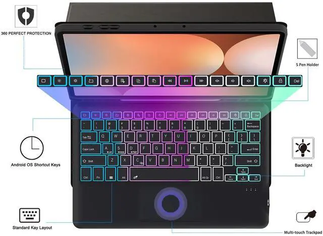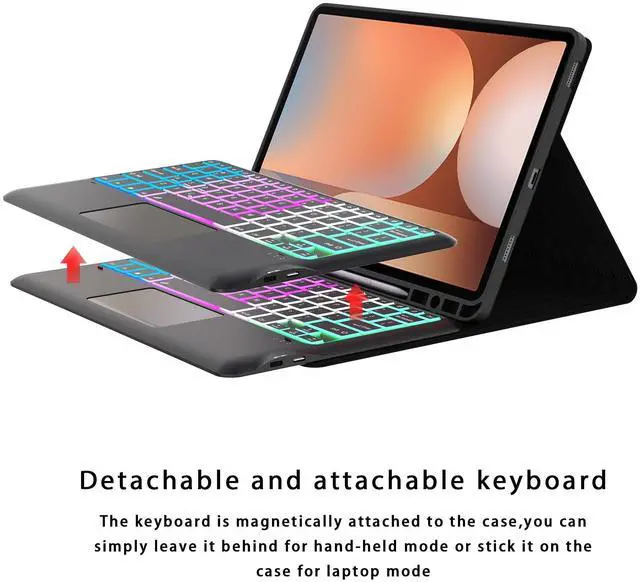 Note: This is a keyboard case for 12.4 inch Samsung Galaxy Tab S9 FE+/S9+/S10+, it doesn't include the tablet and pen, please read the description carefully before purchasing, thank you! ^^ Compatibility-This keyboard case is specially tailor-made for 12.4 inch Samsung Galaxy Tab S10+/S10 Plus 2024 (SM-X820/X826B/X820N/X826N) & 12.4 inch Samsung Galaxy Tab S9 FE Plus 2023 (SM-X610/X616B) & Samsung Galaxy Tab S9 Plus 2023 (SM-X810/X816B/X818U) tablet PC, with 7 color 3-zone-DIY lighting Trackpad Bluetooth keyboard (QWERTY Layout), precise sections enable full access to all connections, sensors, speakers, Microphones and cameras ^^ 3-Zone 7 Color DIY Backlight Keyboard - Set your preferred hue to use the 7 solid backlight options and 3 brightness adjustment modes. The 3-zone keyboard can be configured independently, making your device not only more stylish, but also optimised for dim light operation. Enjoy a visually pleasing and comfortable typing experience. It is also convenient for operations under the weak light for the keyboard, and their work efficiency improves greatly ^^ Multi-Touch Trackpad Keyboard - Equipped with an intelligent touchpad, you can precisely control and navigate, realize the combination of tablet computers and computer functions, and make your tablet like a real laptop.