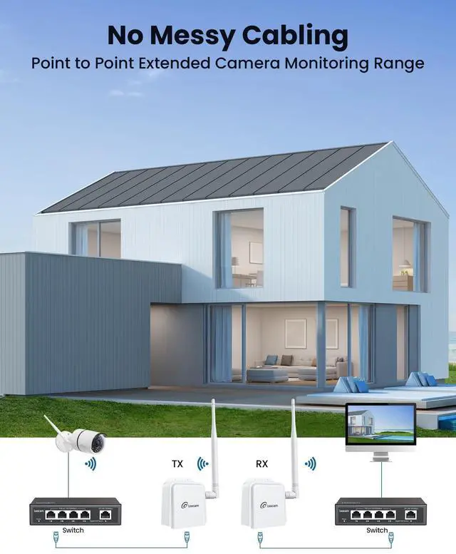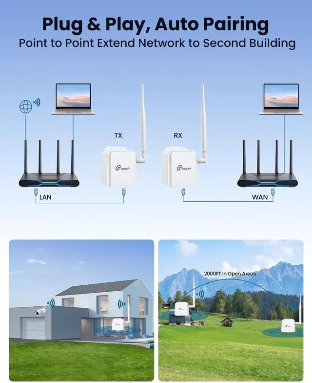 Loocam wifi bridge point to point outdoor works in 902MHz-928MHz band, with strong penetration and bypass capability. Capable of reaching 2000ft wireless transmission distance in open areas. ^^ This ptp wireless bridge uses point-to-point design, suitable for extending network coverage from one building to another. The outdoor wifi bridge is utilized in situations where long-distance network cabling is not feasible. ^^ Plug and play, no complicated setup required. Loocam wifi bridge simply connect the transmitter to your computer and the receiver to your IP camera for seamless video surveillance. Loocam 900mhz wireless bridge is widely used for video surveillance and expanding wifi coverage.