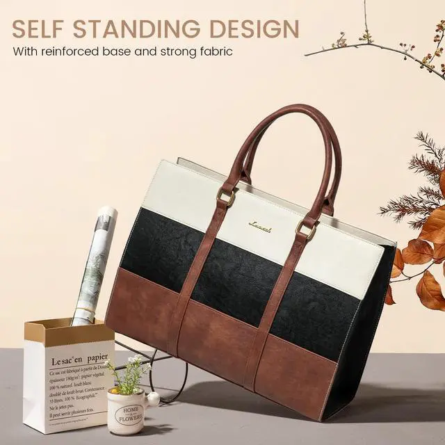 Organized & SpaciousSize: 16.3" x 6"x 12.3". This leather tote bag for women features a separate compartment for a 15.6 -inch laptop and a tablet, 1 large zipper pocket, 2 slip pockets, 2 pen slots, and 1 side pocket, keeping you effortlessly organized all day ^^ Waterproof & DurableCrafted from premium PU leather and high-density nylon lining, this laptop purse is scratch-resistant, waterproof, and easy to clean. Metal feet protect the bottom from wear, while a secure zip-top closure keeps your belongings safe ^^ Easy to UseFeaturing adjustable and detachable shoulder straps from 34 to 52.5 inches, this bag suits women of all heights. Side pockets are perfect for water bottles or umbrellas, making it an ideal work tote, laptop briefcase, or teacher bag ^^ One Bag Fits All Occasions Stylish and sophisticated, this work tote bags for women is perfect for work, business trips, shopping, college, and daily use. It's an ideal choice for Suitable for professional women, students, teachers, and more