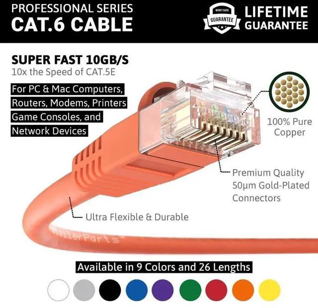 Our cables use high quality, long-lasting materials and feature A highly durable design at an affordable price. ^^ 50 Micron Gold Plated Contacts RJ45 plugs with 50 Micron gold plated contacts and molded strain relief boots provide secure network connection and durability. ^^ Maximum Compatibility Use the Cat6 patch cable to connect devices on a Local Area Network (LAN), such as laptops, PCs and Mac, network servers, printers, routers, switches, game consoles and more. TIA/EIA T-568B standard wiring. UL/CULl listed. RoHS comliant.