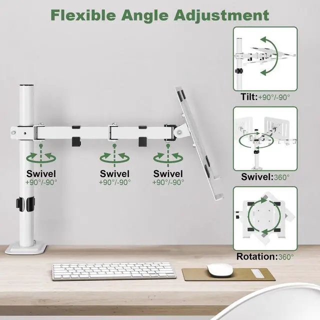 FULL MOTION ARM: Adjustable laptop arm mount offers 90 tilt, 180 swivel, 360 rotation, the height adjustment along the center pole. Arms have three joints that allows you to adjust the position of the notebook anywhere ^^