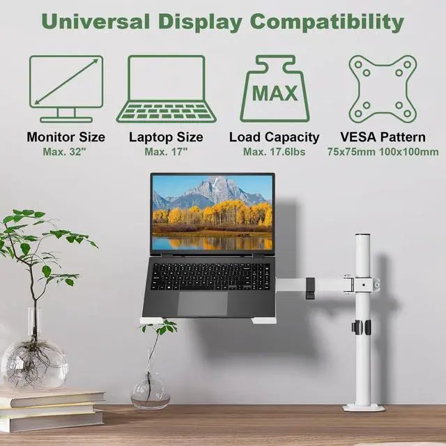 WIDELY COMPATIBILITY: The laptop mount fits Laptop/Notebook up to 17, monitors up to 32 with VESA mounting holes 75x75mm and 100x100mm and supports weight up to 17.6 lbs. The ventilated tray 11.8 x 10.4 is detachable and support you to switch between laptop and screens at will ^^
