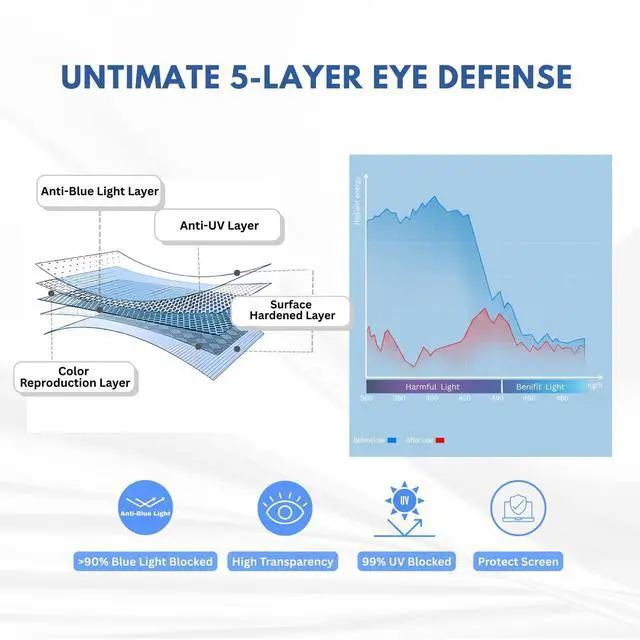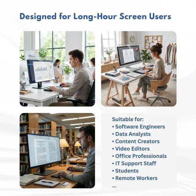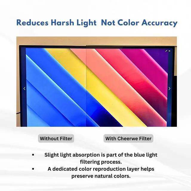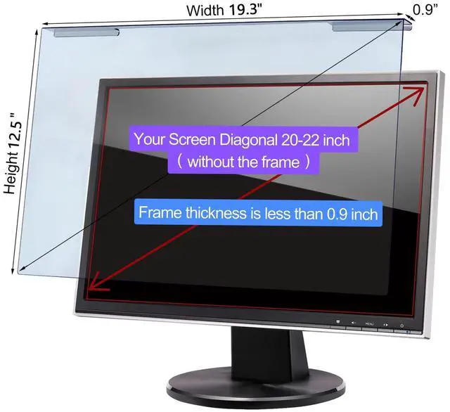 Precise Fit for 2022" Flat Monitors ( 16:9 ) Designed to fit 2022 inch flat monitors (filter size 19.3 12.5 inch). Compatible with HP, Samsung, Dell, ASUS, AOC, Acer, ViewSonic, MSI and other monitor brands. Not compatible with curved monitors. ^^ Reduces Eye Strain Without Over-Filtering Filters harmful blue light in the 385445nm range, and preserves beneficial blue light (455500nm) that supports focus, cognitive performance, and healthy sleep-wake cyclesmaking it suitable for long working hours. Also blocks up to 99% UV light for added eye and skin protection.