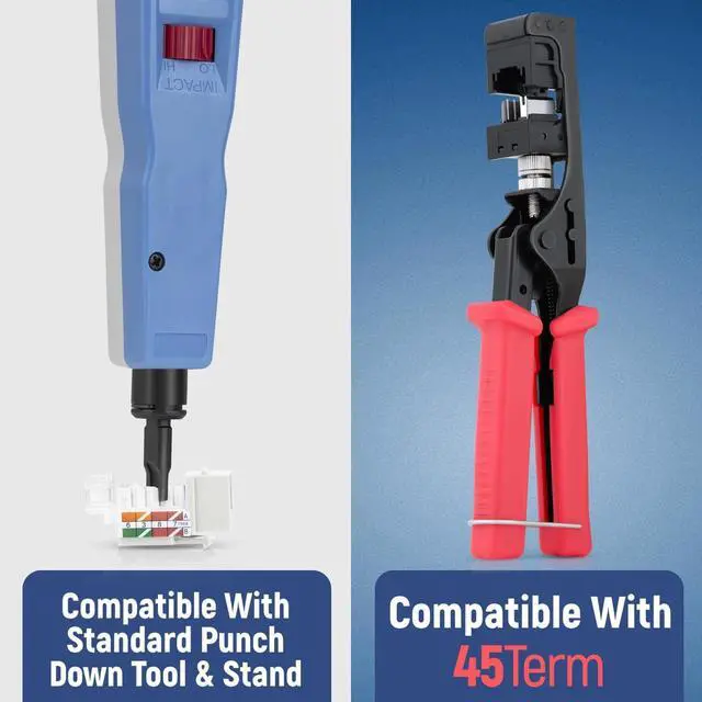• Compatibility - compatible with our 45 Angled speed termination tool - 45Term (B0BL3GS7ZY). The jacks can also work in conjunction with a standard punch down tool and punch down stand for convenience.