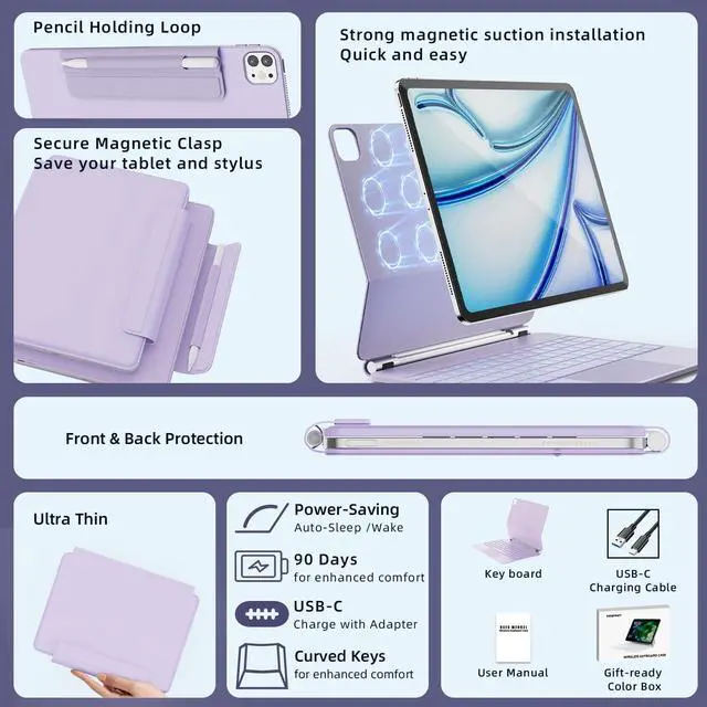 ^^ Safe Buckle Design: The keyboard protective case is equipped with a magnetic buckle at the opening, which enhances the protection of the iPad. It also comes with a storage slot for the Apple Pencil. When you travel with the magic keyboard, you don't have to worry about the safety of the Apple Pencil.