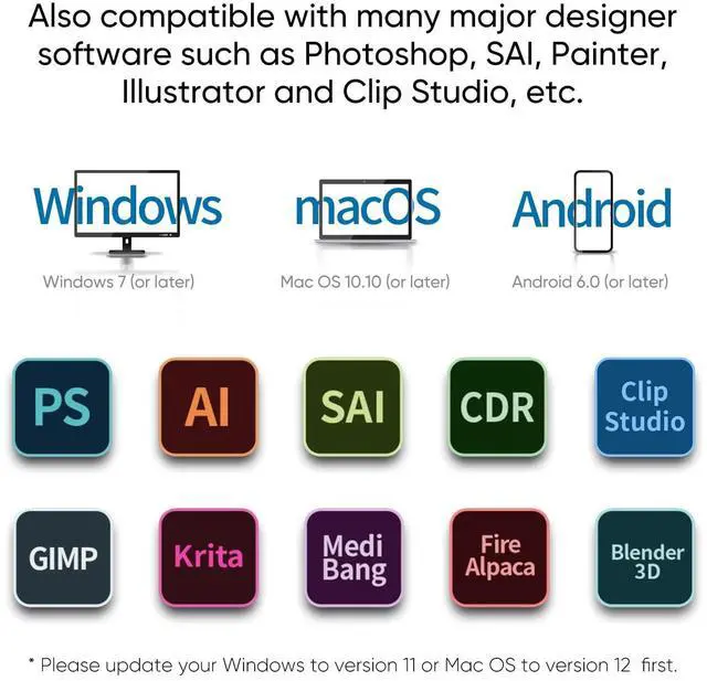 Graphics Tablet: Android Supported-The Deco 01 V3 can be used with Windows 10/8/7, MAC OS X 10.10 and above and Android 6.0 and above and Chrome OS 88.0. 4324.109 or above ^^ Computer