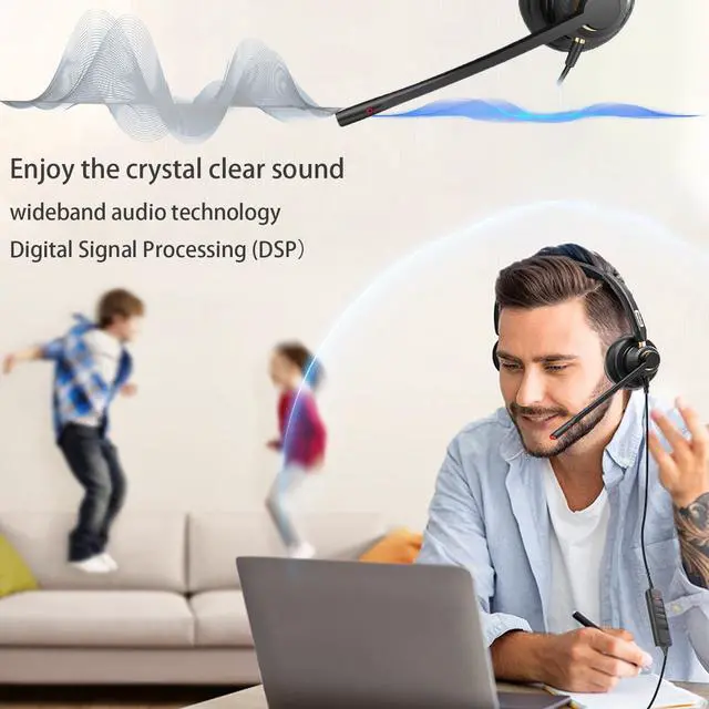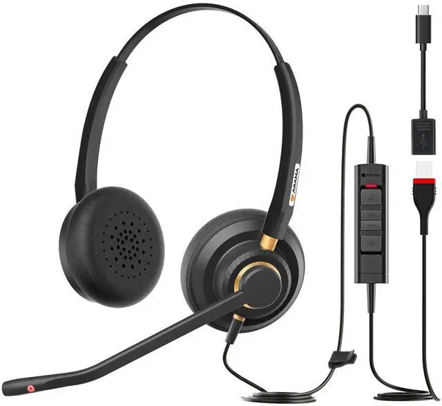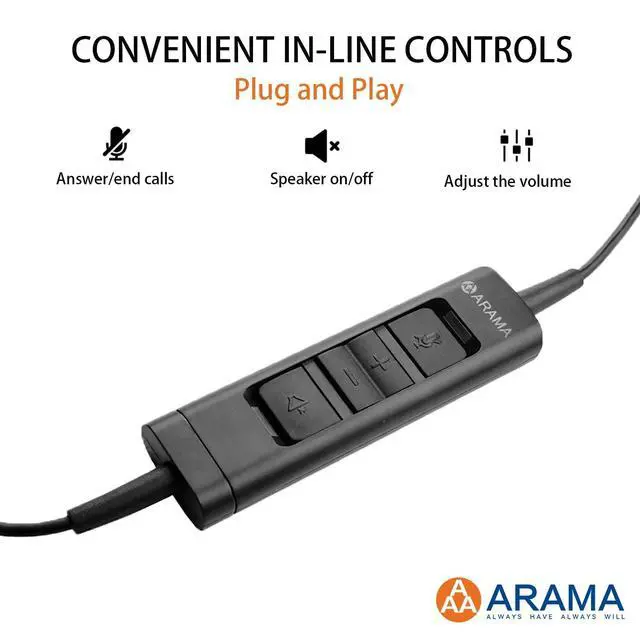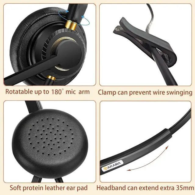 Crystal Clear SoundThis headphone with microphone, featuring advanced wideband audio technology, Digital Signal Processing (DSP), and a Noise-Cancelling microphone, Whether for remote work, video conferences, or on-line class, you'll enjoy professional-quality sound and communication without distractions. ^^ Comfortable & Lightweight DesignCrafted with skin-friendly protein leather ear pads and ergonomic design. Arama A802USB wired headset with mic weighs just 4.26 oz. This lightweight build minimizes ear fatigue, allowing you to wear it extended periods, whether working or online studying. ^^ Adjustable for Optimal FitThis headset with microphone for pc features a headband that can extend extra 35mm, along with 180 rotating ear cups and a 350 adjustable microphone for optimal comfort and sound clarity.