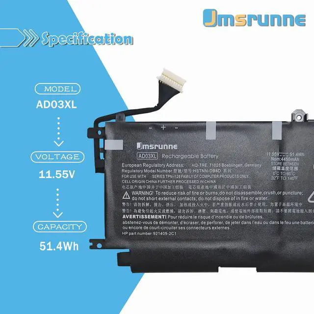 Purchasing Note: Due to the complexity of laptop battery models, you may not be able to accurately determine the model you need to purchase, Please open the back cover of the laptop to confirm the original battery model number ^^ AD03XL battery Compatible laptop Modelsfor HP ENVY 13-AD000TX 13-AD001TX 13-AD002TX 13-AD003TX 13-AD004TX Series; Fit for HP ENVY 13T-AD000 13T-AD100 Series; for HP ENVY 13-AD173CL 13-AD006LA 13-AD008LA 13-AD011LA 13-AD013NA Series; for HP ENVY 13-AD005TX 13-AD006TX 13-AD009TX 13-AD010TX 13-AD007TX 13-AD008TX Series. ^^ Replacement Part NumberAD03XL ADO3XL HSTNN-DB8D 921409-271 921439-855 921409-2C1. ^^ TipsIf the new battery is not recognized during the initial installation, please reinstall and check if the interface is fully connected. Discharge the new battery to 5% not 0%, then charge and cycle 3-4 times to wake up the new battery. ^^ Customer Service <1>. 24 x 7 email support. If you have any problem with battery, please Contact us - in YOUR ORDER options click the contact seller. <2>. 30 days return and 12 months Warrant