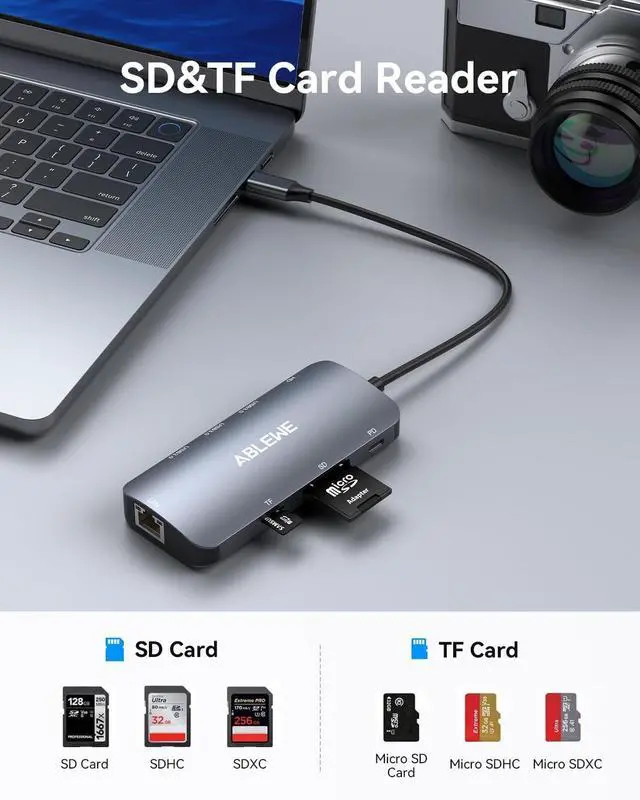 8 in 1 Multiports USB C HubThe intelligent usb c hub ethernet for laptop perfectly combine all functions you need. It extends one USB-C/Thunderbolt 3/ Type-C port to 4K@60Hz HDMI port*1, 1000M Ethernet port, 100W Power Delivery charging port*1, SD/TF Cards Reader, USB 3.0 port*3. It can perfectly settle the problem of only one USB C port of your laptop. All hub ports can work simultaneously. ^^ 1000M Ethernet & SD/TFABLEWE usb c hub multiport adapter built in SD and TF slots easily access files from universal SD card and Micro SD card.