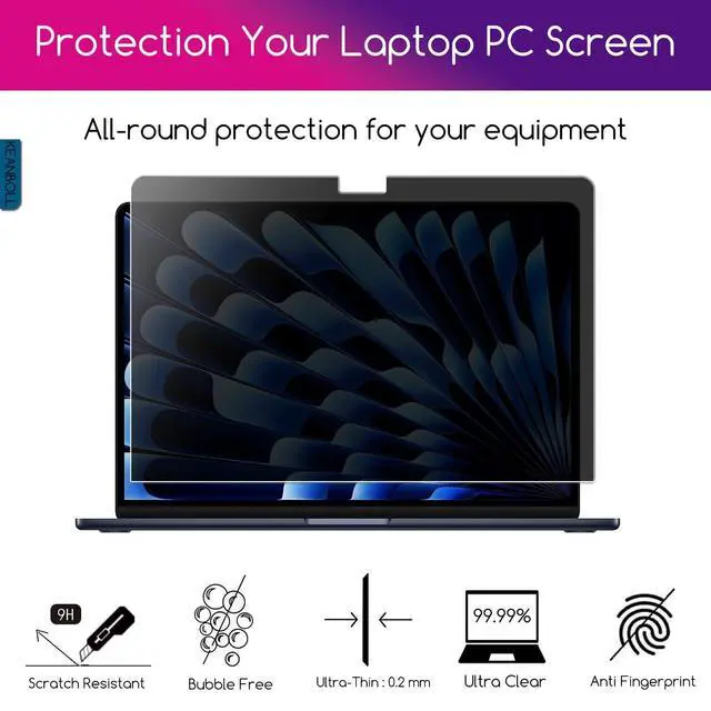 Privacy Tempered Glass Screen Protector for MacBook Air 15 inch Designed specifically for MacBook Air 15 inch, this anti-peep privacy tempered glass screen protector is a must-have accessory. It offers superior protection for your laptop's screen while ensuring your privacy. The tempered glass construction is highly durable and resistant to scratches and impacts. It provides a clear view when looking directly at the screen but becomes opaque from side angles, preventing others from snooping on your work or personal activities. Whether you're working in a coffee shop, on a train, or in a shared office space, this privacy screen protector gives you peace of mind.