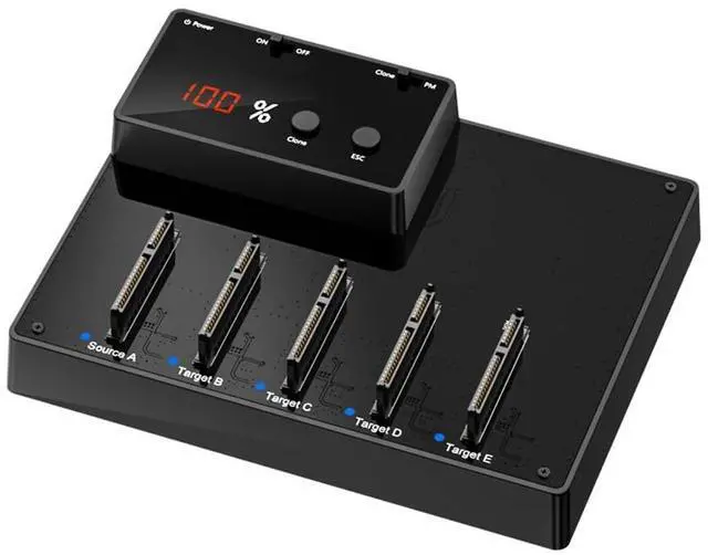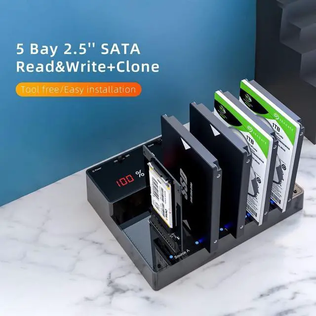 High-Capacity Storage Expansion Accommodates up to five 2.5 SATA SSDs/HDDs simultaneously, supporting a maximum of 30 TB (56 TB). ^^ SuperSpeed USB 3.0 Interface Delivers transfer rates up to 5 Gbps for efficient large-file transfers, backups, and multi-drive management. ^^ 1:4 Offline Cloning/Duplicator Clone one source drive to four target drives without connecting to a host PC, streamlining bulk data imaging and migration. ^^ Simultaneous Multi-Drive Access Enables concurrent read/write operations across all five bays, ideal for IT maintenance, system deployment, and forensic data handling. ^^ Plug-and-Play Compatibility Supports Windows, macOS, and Linux without driver installation.