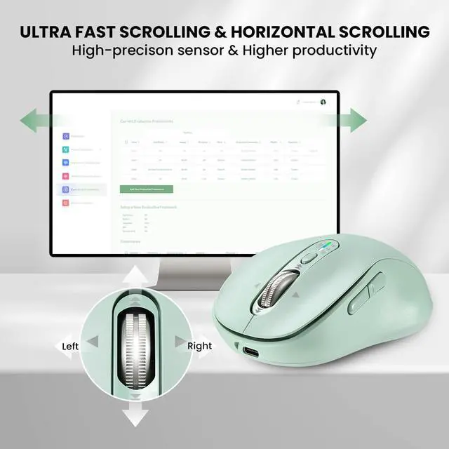 Wireless Bluetooth Mouse for Laptop,USB+BT2,Quiet Ergo Computer Mouses,Metal 4-Way Super Scrolling, 3200 DPI,Rechargeable,10 Button,Plug&Play,Multi Device Cordless Mice for iPad,Tablet,Mac,PC(Green)