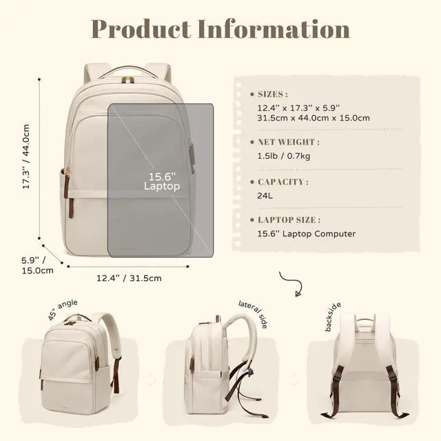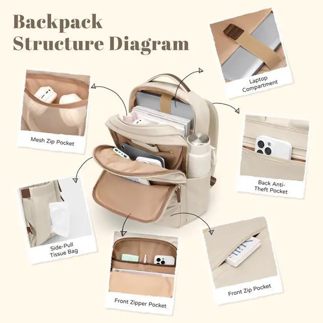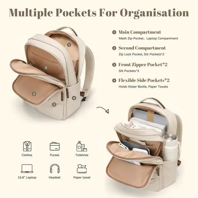 SMART STORAGE & ORGANIZED LAYOUT - Designed with 1 main compartment, 1 mesh zip pocket, 1 padded laptop sleeve (fits laptops up to 15.6 inch), 1 secondary compartment, 1 inner zip pocket, 1 mesh slip pocket, and 2 insert pockets. Exterior includes 2 front zip pockets (with 2 insert pockets + 1 pen slot), 1 rear zip pocket, 1 side pocket, 1 tissue side pocket, 1 earphone port, and 1 luggage strap. ^^ STYLISH & PRACTICAL FOR DAILY USE - With a sleek and elegant design in Apricot, Black, Champagne, or Atrovirens, this 24L backpack ( 31.5 x 44 x 15 cm / 12.4 x 17.3 x 5.9 inches) is ideal for work, business trips, errands, leisure outings, and even as a practical gift or mom bag.