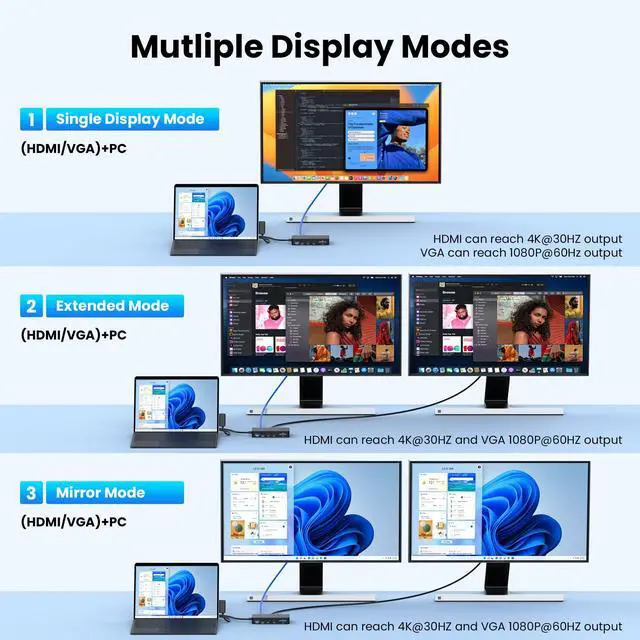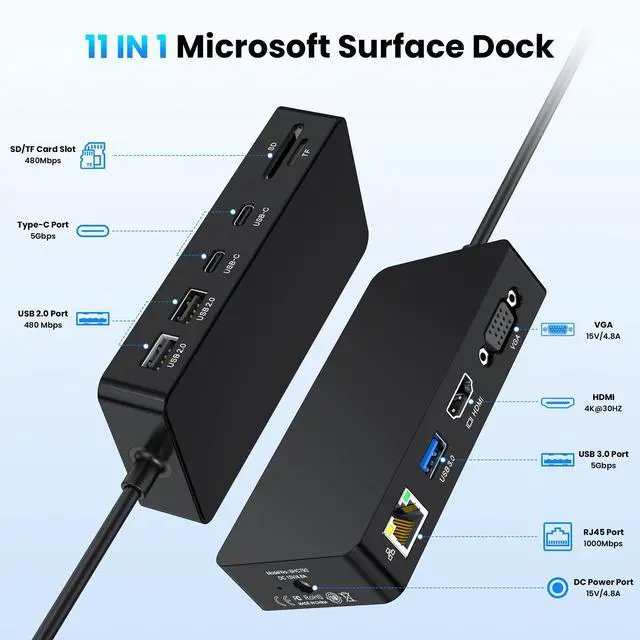 11-IN-1 New Microsoft Surface Docking StationEquipped with dual-side Surface Magnetic Connect technology, lets you plug in and out freely, never worry about access to incorrect interface direction, offers a range of connectivity options in one compact unit for all your peripherals: 4K@60HZ ultra HD HDMI Port and 1080P@60Hz VGA Port, 1000Mbps Gigabit RJ45 Port, 2x USB C Data Port, USB 3.0 Port, 2x USB 2.0 Ports, SD/TF Card Reader Slots, 72W DC Power Charging Port. A must-have Microsoft Surface Docking Station accessory for you to help improve efficiency while working, studying, meeting or gaming. ^^ Support Dual Displays Ultra HD 4K HDMI & VGAThis Surface Docking Station Supports Dual Displays (4K@30Hz HDMI+1080@60Hz VAG) with extend or mirror mode, lets you enjoy stunning visuals and crystal-clear display quality, boosts your efficiency 2 times. Whether you need to mirror or expand your screen, this new Surface Dock always ensures an exceptional use experience.