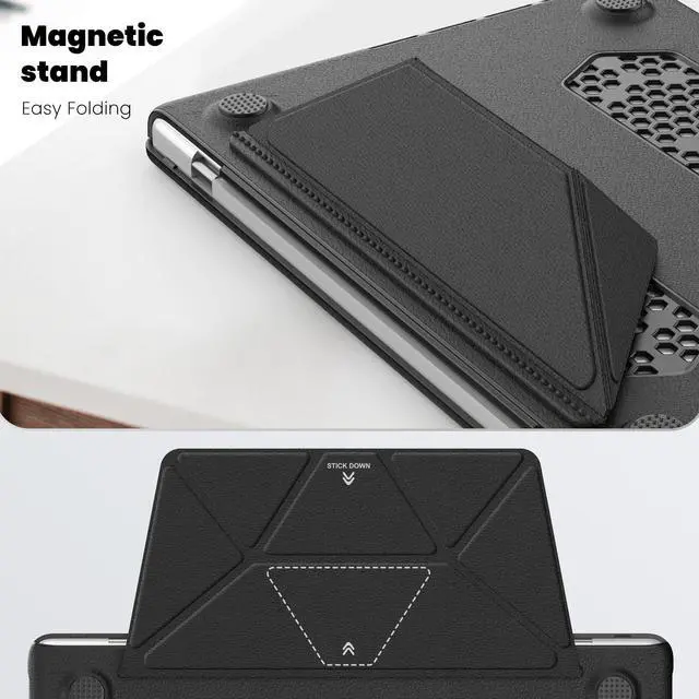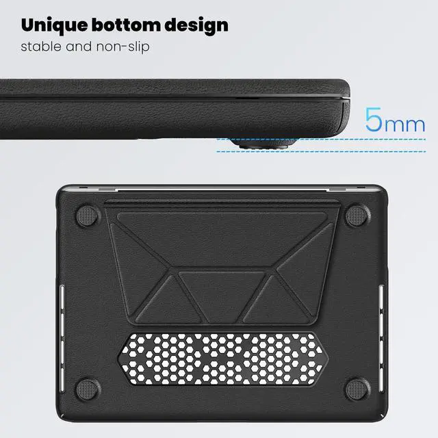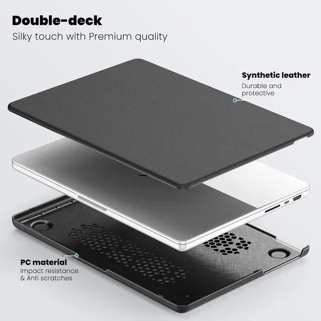 Touch ID (Model: A3434 / A3112 / A3401 / A3185 / A2918 / A2992 / A2779 / A2442). ^^ The case combines PU leather and PC material for enhanced durability. The fabric provides a comfortable, non-slip surface, while the PC material offers impact resistance and protection against scratches, ensuring your MacBook Pro 14 remains safe from daily wear and tear. ^^ This protective case features a built-in magnetic stand that allows for easy folding and stable positioning of your MacBook. The stand facilitates ergonomic viewing angles, enhancing comfort and productivity during prolonged use. ^^ The case is designed with precise cutouts that align perfectly with all ports and functions of the MacBook Pro 14. This ensures seamless access to charging ports, USB-C ports, and other essential interfaces without needing to remove the case. ^^ The bottom of the case includes a perforated design that promotes better airflow, aiding in heat dissipation. This feature helps maintain optimal operating temperatures for your MacBook, preventing overheating during intensive tasks.